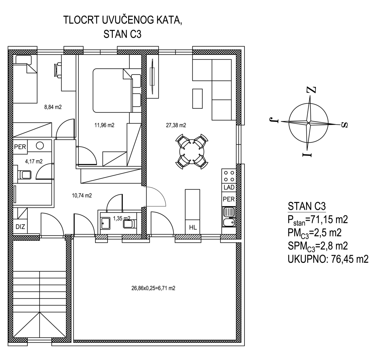 Stan C3 na uvučenom katu ove elegantne zgrade donosi udobnost doma uz blizinu prirode. S površinom od 71,15 m2, ovaj stan nudi obilje prostora za uživanje, a prostrana terasa poziva na opuštanje i uživanje na otvorenom.